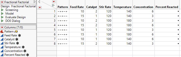Click Make Table to create a data table that contains the runs for your experiment. In the table, the high and low values that you specified appear for each run.