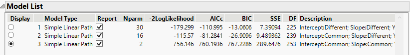 The Model List report gives summary statistics and other options for every fitted model. Figure 7.17 shows an example of the Model List with summaries for three models.