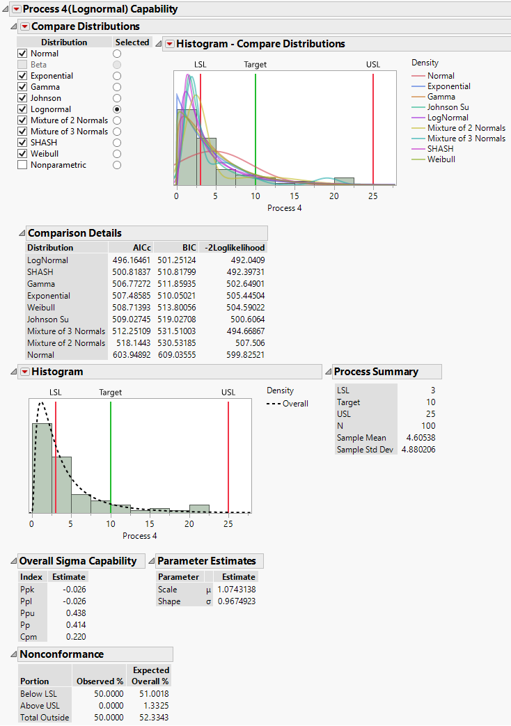 The title of the report for Process 4 indicates that the capability calculations are based on a lognormal fit. All of the check boxes in the Compare Distributions report, except the boxes for Nonparametric and Beta, are checked, indicating that these nine distributions are fit. (This is because you requested a Best Fit in the launch window.) The button that is selected in the Selected column indicates that the Lognormal distribution is the distribution that is used in the remainder of the Process 4(Lognormal) Capability report to estimate capability and nonconformance.