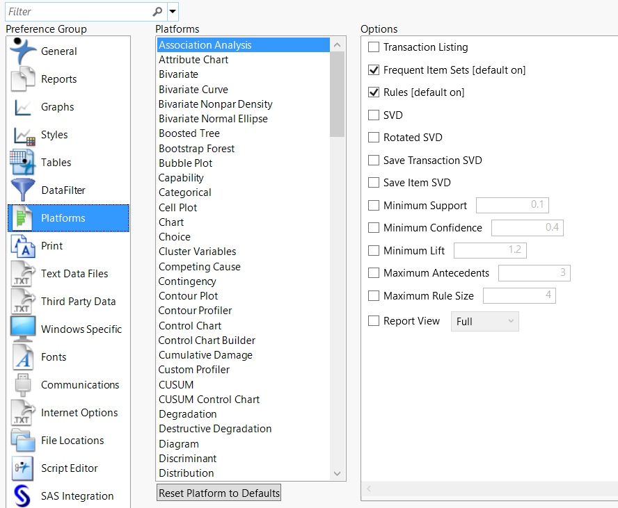 Each analysis report has a variety of plot and table options that are shown by default. However, there might be additional options that you want to see each time you run a particular analysis. For example, a bivariate analysis shows a scatterplot by default, but you might also always want to see a linear fit each time. By selecting the Platforms option in the left panel of the Preferences window, you can set the default options for analyses. (Analyses are run by using platforms, such as the Bivariate platform. Thus, the name of this category is Platforms.)