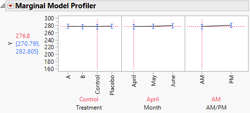 By dragging the line in the plot for Month from April to June, you see that, for Treatment B, the predicted AM mean for Y decreases from 276.8 in April to 191.2 in June.