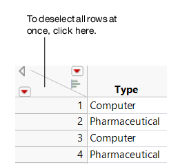 You can select rows, columns, or cells within a data table. For example, to create a subset of an existing data table, you must first select the parts of the table that you want to subset. Also, selecting rows can make data points stand out on a graph. Select rows and columns manually by clicking, or select rows that meet certain search criteria. This section contains the following information: