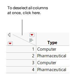 Deselect all columns | Click in the upper-triangular space in the top left corner of the table (Figure 3.9). |