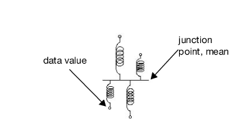 First, springs are the machine of fit for a continuous response model (Farebrother 1987). Suppose that you have n points and that you want to know the expected value (mean) of the points. Envision what happens when you lay the points out on a scale and connect them to a common junction with springs (Figure A.7). When you let go, the springs wiggle the junction point up and down and then bring it to rest at the mean. This is what must happen according to physics.