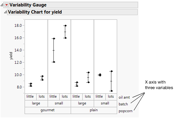 This example uses the Popcorn.jmp data table with data from a popcorn maker. The yield (the volume of popcorn for a given measure of kernels) was measured for each combination of popcorn style, batch size, and amount of oil used.