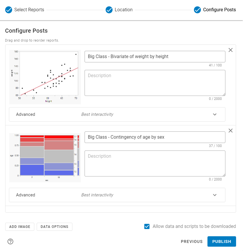 Allows data tables and scripts associated with the reports to be downloaded. If you do not select this option, in JMP Live there is no download option next to the data table names and no JSL script to re-create the report. See Note on Data Accessibility.