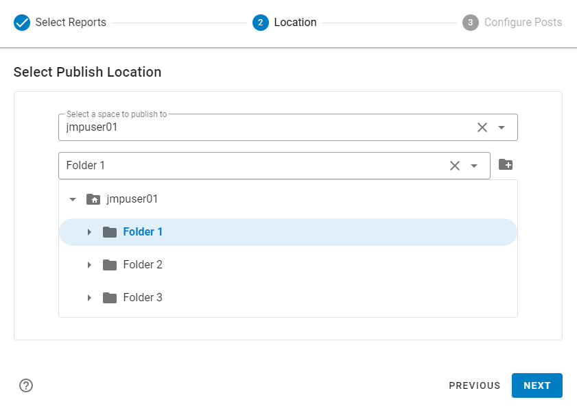 1. Select an existing space from the list or enter text to find a space that you want to publish your report to.