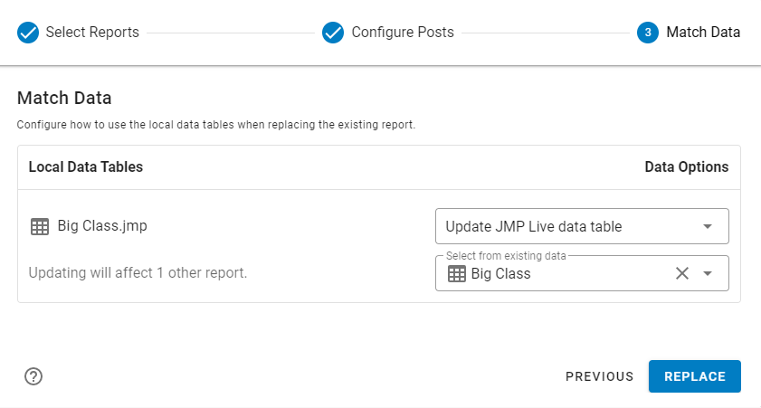 Choose whether to publish new data or use existing data in the JMP Live space you are publishing to.