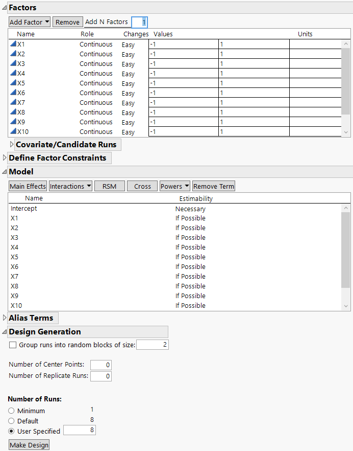 In this example, you want to construct a supersaturated design to study 12 factors in 8 runs. To create a supersaturated design, you set the Estimability of all model terms (except the intercept) to If Possible.