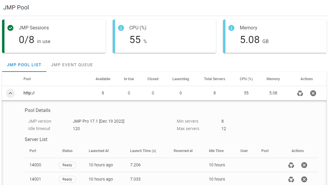 In JMP Live, a JMP pool has a number of JMP sessions running on different ports. You can monitor the status of JMP pools and events in JMP pools under Admin > JMP Pool Status .