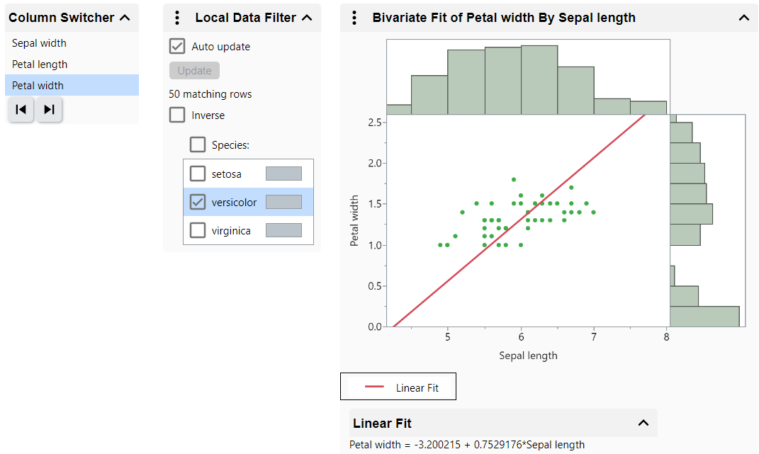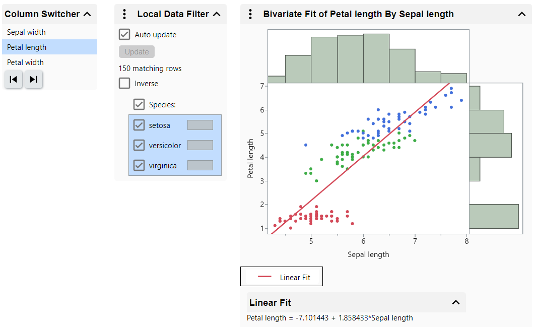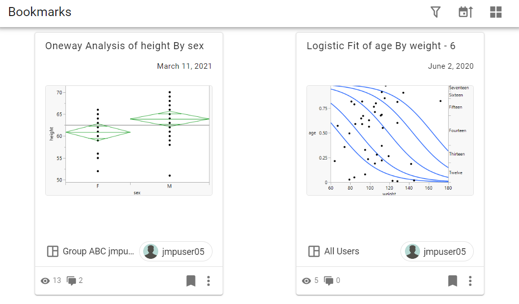 Create visualizations with your data in JMP and share your analyses or data as posts in JMP Live. Anyone viewing these posts has the interactive capabilities of JMP to explore your data.
