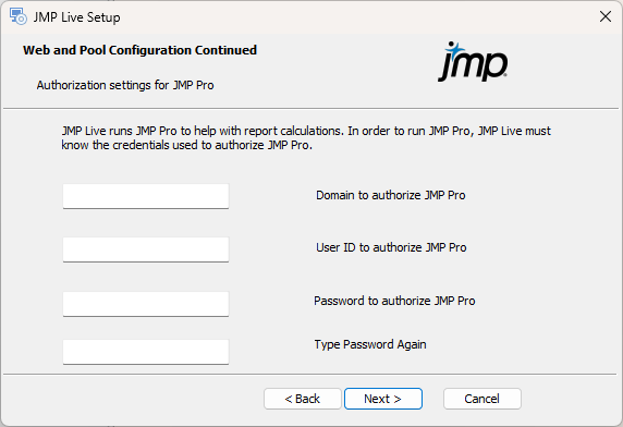 Go to the directory where JMP Live is installed. By default, JMP Live is installed here: C:\Program Files\JMP\JMP Live\JMPLive.