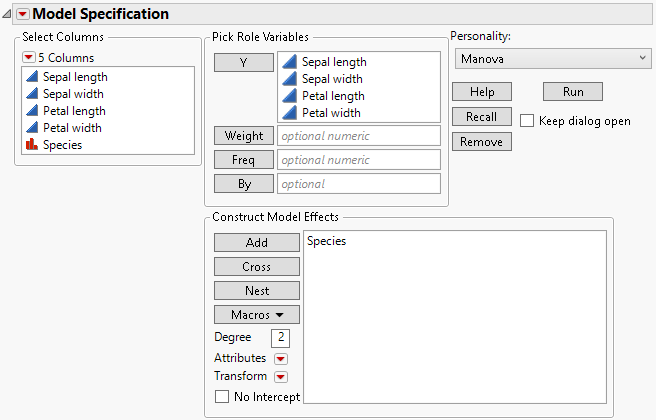 Fitting Linear Models > Multivariate Response Models > Launch the Manova Personality