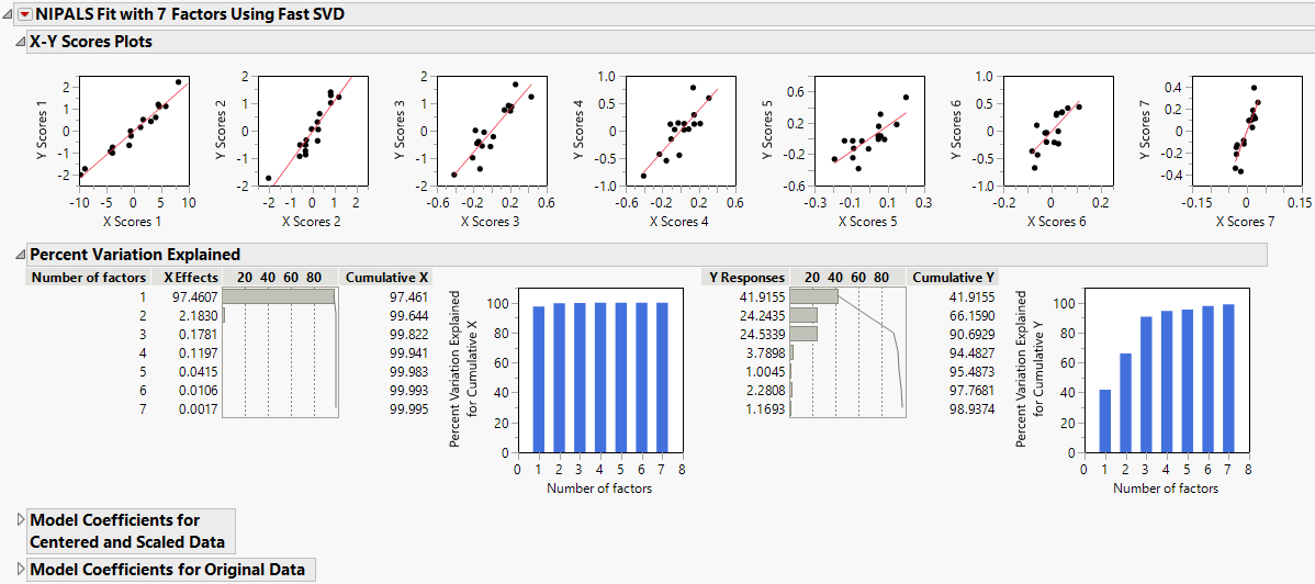 Shows the percent variation and cumulative percent variation explained for both X and Y. Results are given for each extracted factor.
