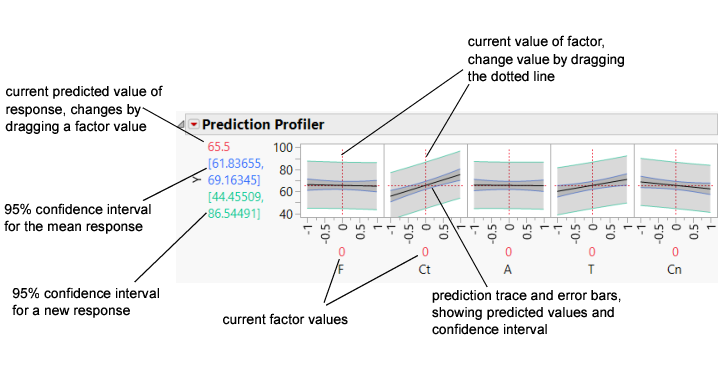 • The black lines within the plots show how the predicted value changes when you change the current value of an individual X variable. The 95% confidence interval for the predicted values is shown by a dotted curve surrounding the prediction trace (for continuous variables) or an error bar (for categorical variables).