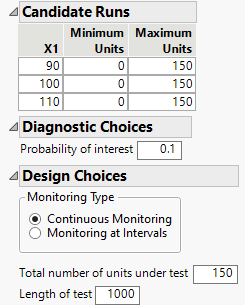 (Available only for Continuous Monitoring.) Specify the length of time during which units are on test. When you make the design table, record each unit’s failure time or whether it was right censored.
