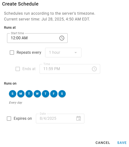 .By default, the list is sorted by which schedule runs next. Schedules that are actively running are highlighted.