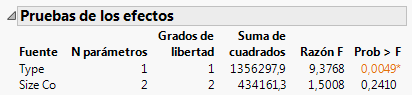El informe Pruebas de los efectos (consulte la Figura 5.24) muestra los resultados de las pruebas estadísticas. Existe una prueba para cada efecto incluido en el modelo en la ventana Ajuste del modelo: Type, Size Co y Type*Size Co.