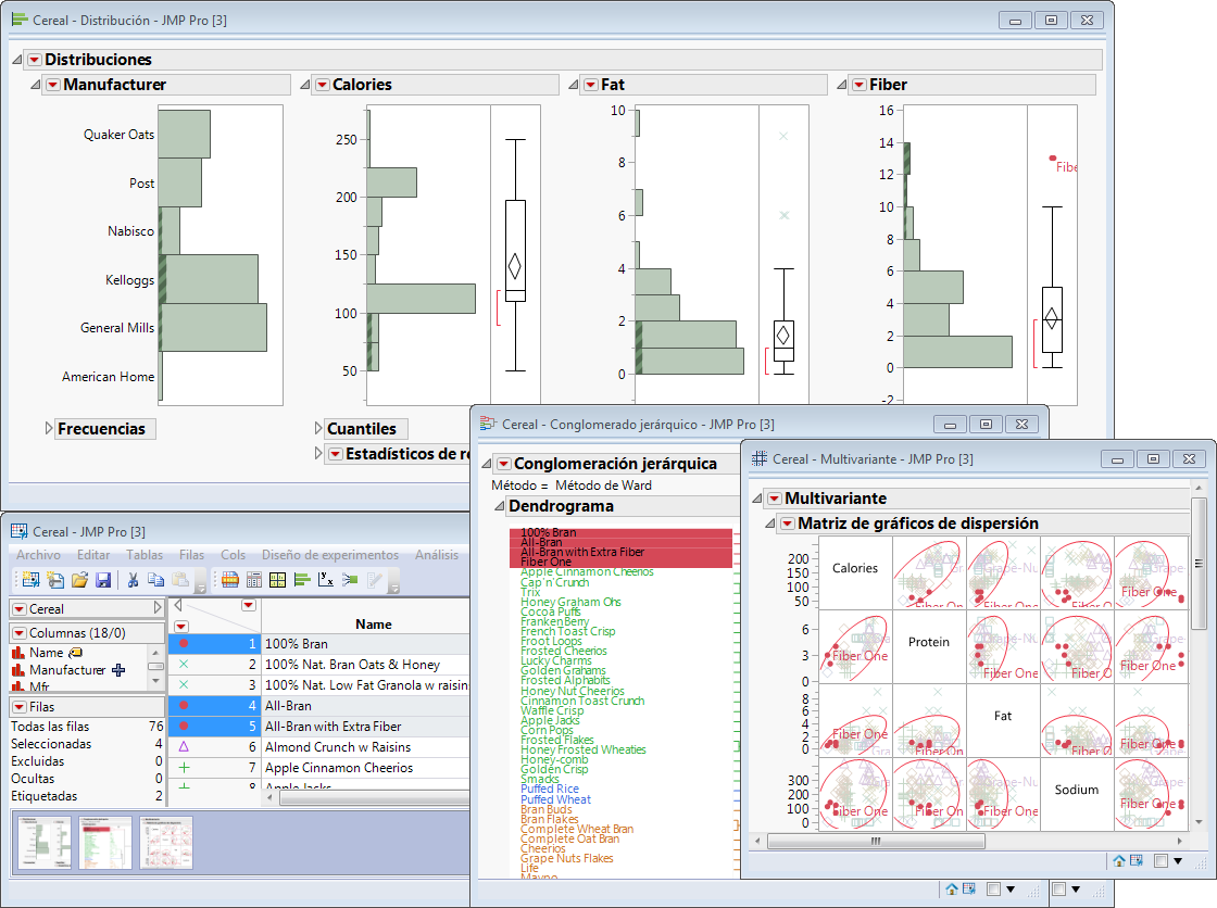 Este capítulo le muestra, paso por paso, un análisis de la tabla de muestra de datos Cereal.jmp instalada con JMP. Aprenderá a explorar los datos en las plataformas Distribución, Multivariante y Conglomerado jerárquico.