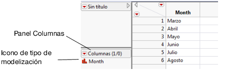 En el panel Columnas, consulte el icono de tipo de modelización situado a la izquierda del nombre de columna. Ha cambiado para reflejar que ahora Month es nominal (anteriormente era continua). Compare el tipo de modelización que se muestra para la columna 1 en la Figura 3.3 y para Month en la Figura 3.4. Esta diferencia es importante y se analiza en Ver o cambiar la información de columna.