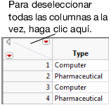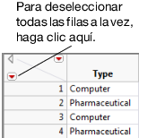 JMP selecciona todas las filas que tengan Size Co igual a "medium". Hay siete filas que cumplen esta condición.
