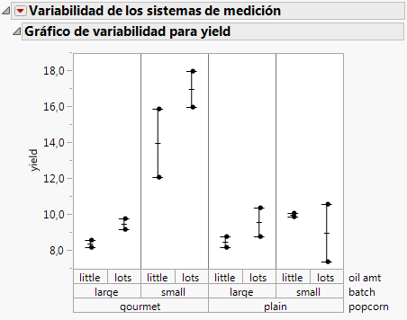 En este ejemplo se utiliza la tabla de datos Popcorn.jmp, que contiene datos de producción de palomitas de maíz. El rendimiento (volumen de palomitas obtenidas a partir de cierto número de granos de maíz) se midió para cada combinación de estilo de palomita de maíz, tamaño de lote y cantidad de aceite empleado.