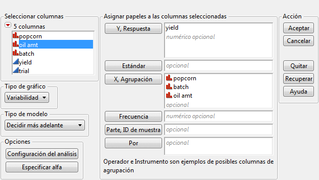 Nota: El orden en que se asignan las variables al papel X, Agrupación es importante, ya que el orden en esta ventana determina el orden de anidamiento en el gráfico de variabilidad.