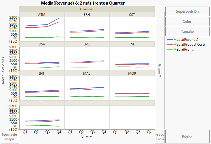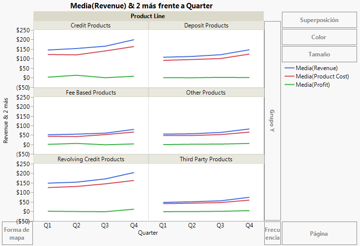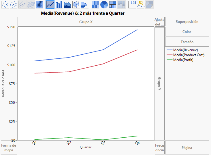 Figura 4.32 muestra los ingresos, el coste y la rentabilidad por línea de producto. El analista de negocio estaba interesado en ver las diferencias de rentabilidad entre líneas de producto. Los gráficos de línea de la Figura 4.32 pueden aportar algunas respuestas, como sigue: