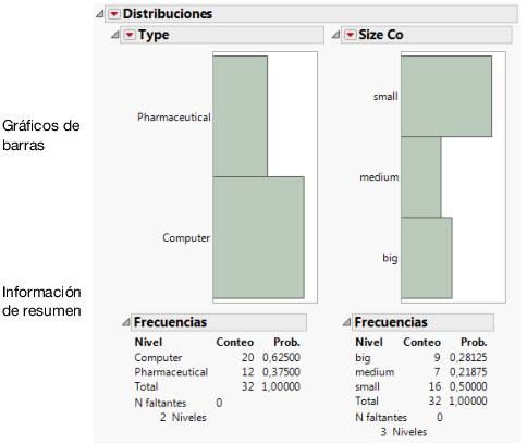 En este ejemplo se utiliza la tabla de datos Companies.jmp, que contiene datos de tamaños y tipos de un grupo de empresas.
