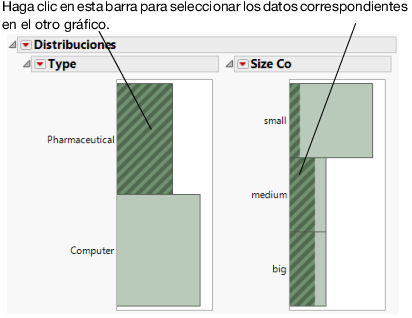 Por ejemplo, supongamos que queremos ver la distribución del tamaño de empresa entre las empresas farmacéuticas. Haga clic en la barra Pharmaceutical del gráfico de barras correspondiente a Type. En el gráfico de barras correspondiente a Size Co se resaltan las empresas farmacéuticas. La Figura 4.7 muestra que, aunque la mayoría de las empresas de esta tabla de datos son pequeñas, la mayoría de las empresas farmacéuticas son medianas o grandes.