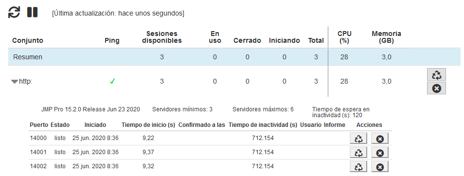 En el resumen que encontrará en la parte superior se muestran cuántas sesiones de JMP hay disponibles, en uso, cerradas o iniciándose, y cuántas sesiones de JMP tiene en total. También verá las estadísticas de CPU y memoria que indican la carga que tienen las sesiones.