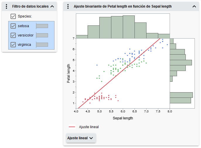 Si su informe JMP contiene múltiples gráficos, se vinculan los datos de todos los gráficos. Es decir, si selecciona datos, se resaltan en todos los gráficos asociados.