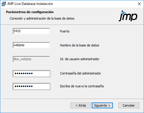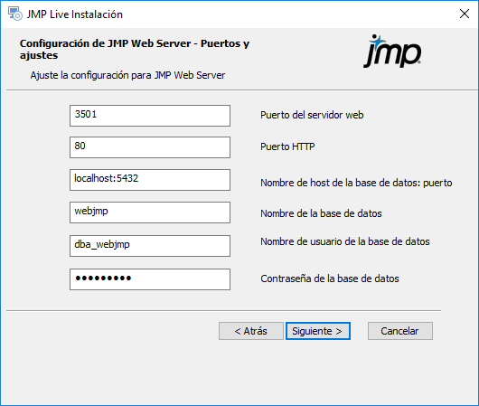 Nota: La siguiente información debe coincidir con los datos introducidos al instalar la base de datos de JMP Live. Consulte Instalación de JMP Live Database.