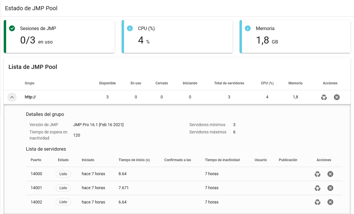 Un JMP Pool tiene varias sesiones de JMP ejecutándose en distintos puertos. Puede supervisar el estado de los JMP Pools en Administrador > Estado de JMP Pool. Haga clic en la flecha gris situada junto a la dirección web para ver las sesiones de JMP de ese grupo.