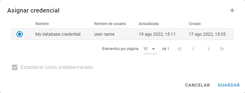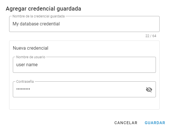 Agregue un nombre identificador para la credencial y su Id. de usuario y contraseña para la base de datos. Para obtener más detalles, consulte Asignar credenciales.