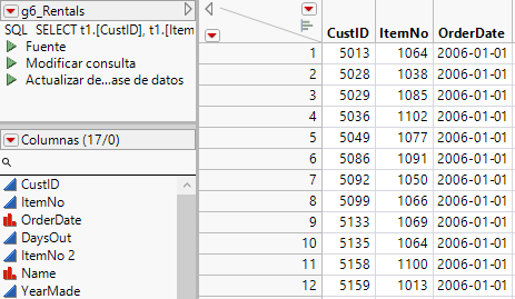 Utilice el generador de consultas para importar datos de una base de datos a una tabla de datos de JMP. Para obtener más detalles, consulte la sección sobre cómo crear consultas SQL en el libro Con JMP.