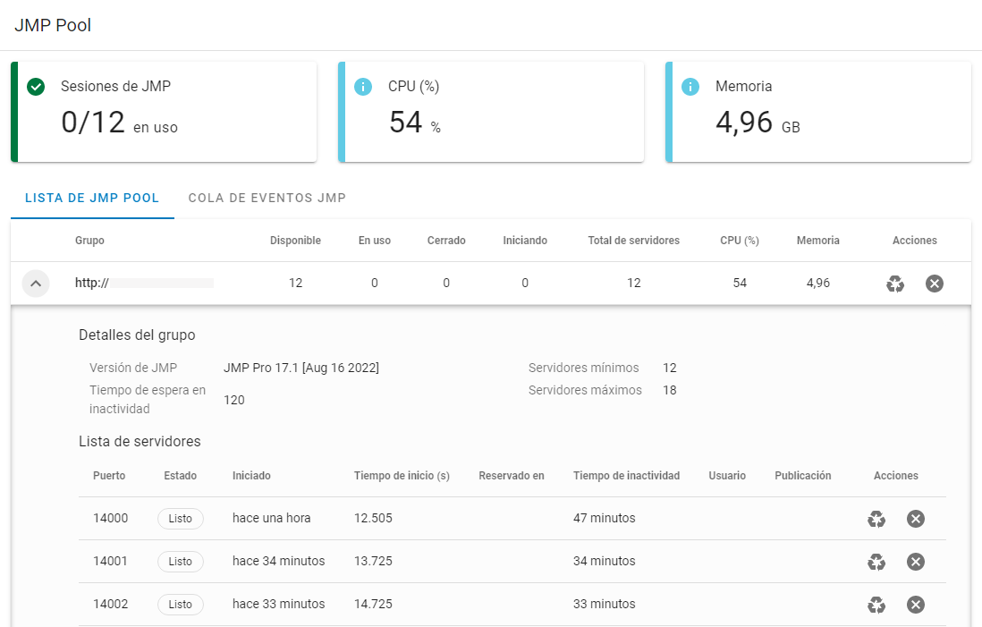 En JMP Live, un JMP Pool tiene varias sesiones de JMP ejecutándose en distintos puertos. Puede supervisar el estado de los JMP Pools y los eventos en JMP Pools en Administrador > Estado de JMP Pool