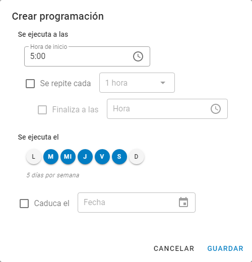 Note: Las programaciones están basadas en la zona horaria en la que se encuentre su servidor de JMP Live.