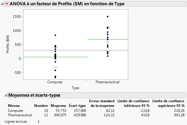 Utilisez les limites de l’intervalle de confiance pour définir précisément la différence de bénéfices entre les deux types de société. Examinez les valeurs Limite de confiance supérieure (95 %) de la différence et Limite de confiance inférieure (95 %) de la différence de la Figure 5.18. L'analyste financier conclut que le bénéfice moyen des laboratoires pharmaceutiques est supérieur de 343 à 926 millions de dollars à celui des sociétés informatiques.
