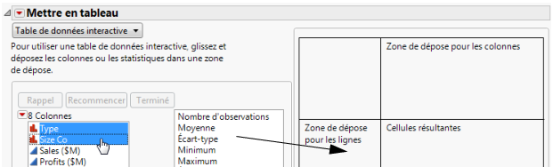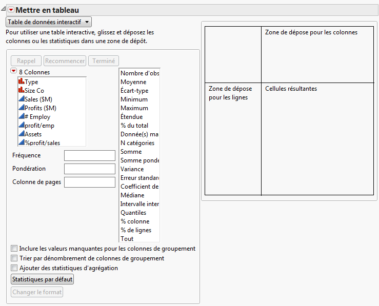 Créez des tableaux récapitulatifs à l'aide de la commande Résumé ou Mettre en tableau. La commande Résumé crée une nouvelle table de données avec laquelle vous pouvez effectuer des analyses et créer des graphiques, exactement comme avec n’importe quelle autre table de données. La commande Mettre en tableau crée une fenêtre de rapport contenant un tableau des données de résumé. Vous pouvez également créer une table à partir de ce rapport.