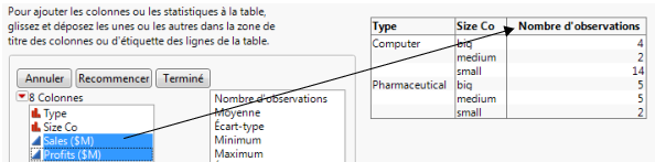 JMP calcule la moyenne des valeurs Sales ($M) ainsi que celle des valeurs Profit ($M) pour chaque combinaison Type / Size Co.