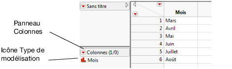 Dans le panneau Colonnes, observez l’icône Type de modélisation située à gauche du nom de colonne. Elle a changé et reflète le fait que Month contient désormais des données nominales (et non plus continues). Comparez le type de modélisation de la colonne 1 affiché dans la Figure 3.3 et celui de la colonne Month affiché dans la Figure 3.4. Cette différence importante est traitée dans le paragraphe Afficher ou modifier les informations d'une colonne.