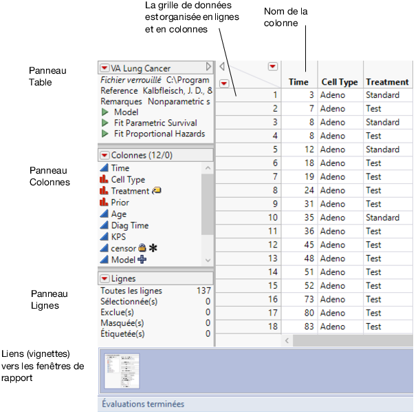 Le panneau Lignes affiche le nombre total de lignes de la table de données, ainsi que le nombre de lignes sélectionnées, exclues, masquées et étiquetées. La Figure 2.4 indique qu'il y a 137 lignes dans la table.
