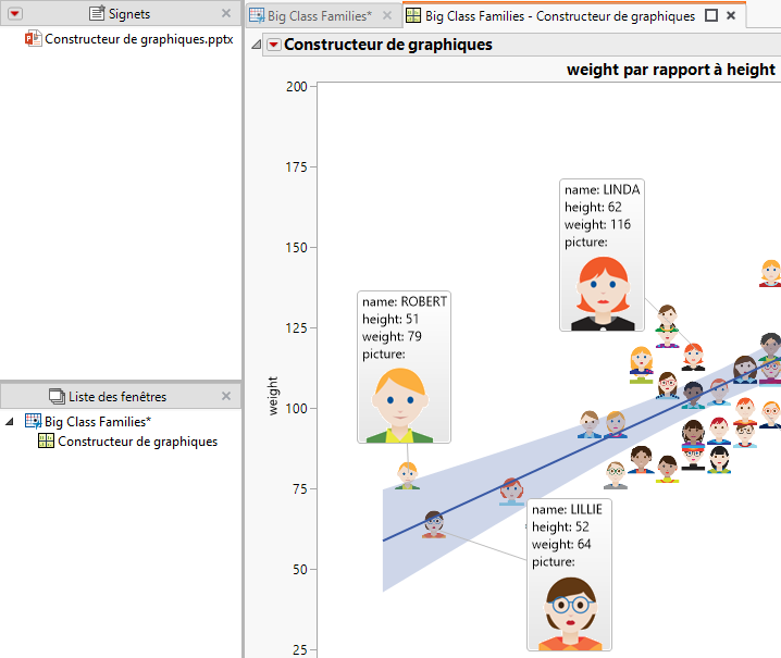 Dans JMP, depuis le menu du triangle rouge de Signets, sélectionnez Ajouter les fichiers, naviguez jusqu'au fichier Graph Builder.pptx que vous avez créé, puis cliquez sur Ouvrir (Windows) ou Choisir (Macintosh).