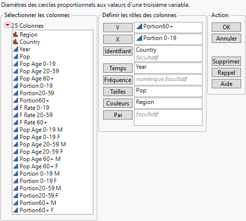 Cliquez sur le bouton de lecture/arrêt pour animer le graphique en bulles. Notez qu'au fil du temps, la proportion des moins de 20 ans (Portion 0-19) diminue au profit des plus de 60 ans (Portion60+).