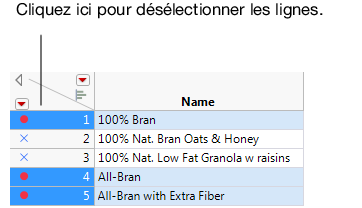 Dans la table de données Cereal.jmp, cliquez sur le triangle du bas situé en haut du panneau Colonnes pour désélectionner les lignes.