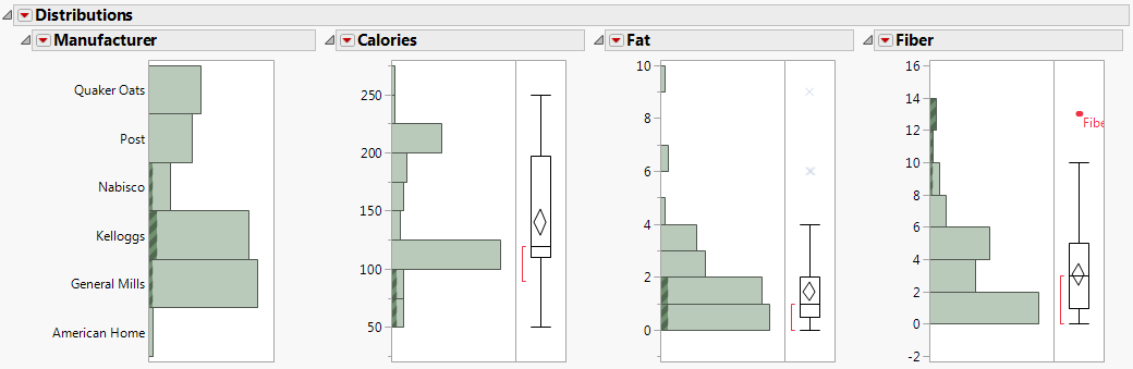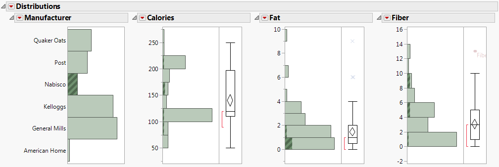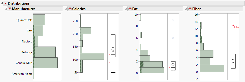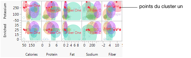 Dans le fichier Cereal.jmp, la ligne contenant Fiber One est étiquetée. Dans les graphiques, cette étiquette permet d'afficher le nom des céréales à côté d'un point de données. Pour voir l'étiquette entière, faites glisser la bordure verticale la plus à droite vers la droite. Placez votre curseur sur le point de données non étiqueté pour voir « All Bran with Extra Fiber ».