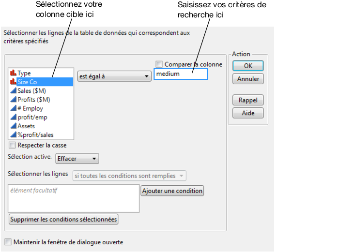 Vous pouvez également demander à JMP de trouver toutes les lignes qui répondent à certains critères.