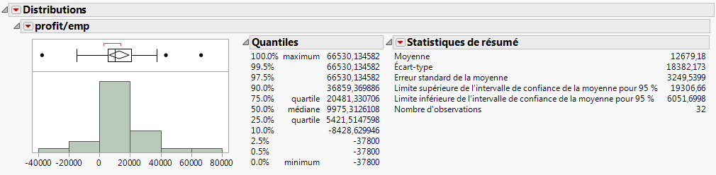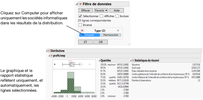 Utilisez la fonction Filtre de données pour sélectionner des sous-ensembles de données complexes, masquer ces sous-ensembles dans les graphiques ou les exclure des analyses, le tout de manière interactive. Par exemple, examinez le bénéfice par employé des sociétés informatiques et pharmaceutiques.