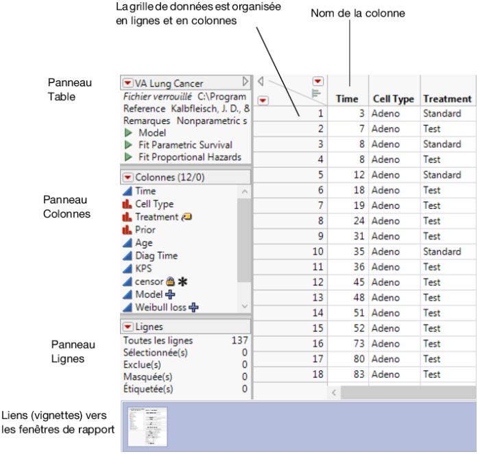 La grille de données contient les données organisées en lignes et en colonnes. En général, les lignes correspondent à des observations et les colonnes (aussi nommées variables) à des informations sur ces observations. Dans la Figure 2.4 Une table de données, chaque ligne correspond à un sujet test et 12 colonnes fournissent des informations. Même si les 12 colonnes ne peuvent pas toutes apparaître dans la grille de données, le panneau Colonnes les recense toutes. Les colonnes fournissent diverses informations : date, type de cellule, traitement, etc. Chaque colonne possède un en-tête (un nom). La ligne des en-têtes de colonne n'est pas comptabilisée dans le nombre total de lignes de la table.